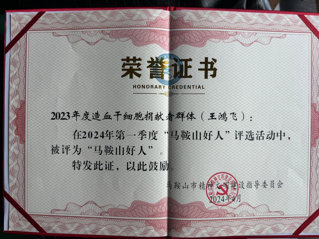 推荐名额仅1人。王鸿飞同学作为安徽工业大学第三位捐献造血干细胞的在校大学生,是中华骨髓库安徽分库第91例捐献者,也是马鞍山最年轻的造血干细胞捐献者。
