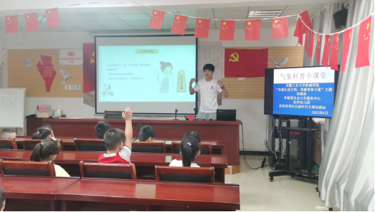 本科生第四党支部依托暑期社会实践平台,赴花和佳苑社区党群服务中心开展以“科普气象防灾减灾,助力建设安全家园”为主题的宣讲活动,活动宣讲对象为马鞍山花和佳苑幼儿园的23名小朋友。