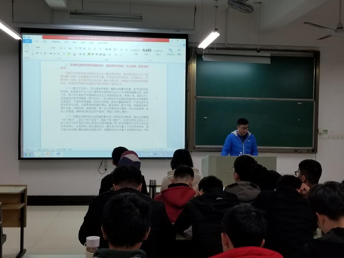 11月28日,污污漫画 本科生第一党支部在机械楼407教室召开党员大会,专题学习《中共中央关于坚持和完善中国特色社会主义制度 推进国家治理体系和治理能力现代化若干重大问题的决定》。会议由支部书记章军主持,全体学生党员参加会议。