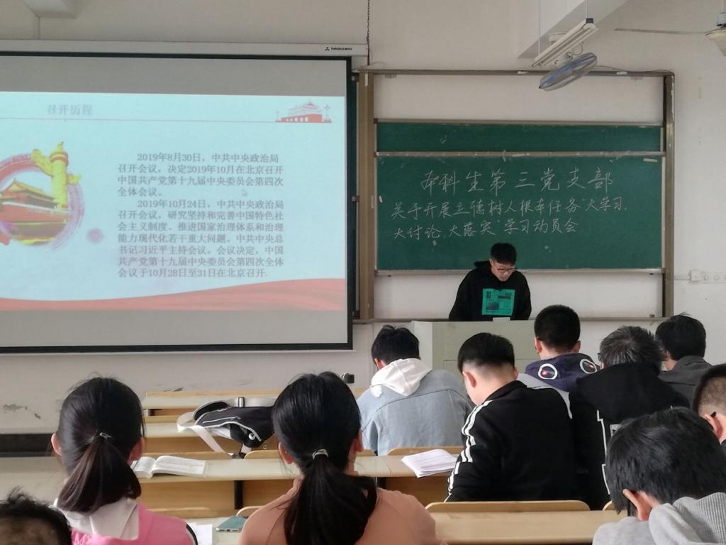 11月13日中午,污污漫画 本科生第三党支部在机械楼405组织学习十九届四中全会精神。支部全体成员出席会议。