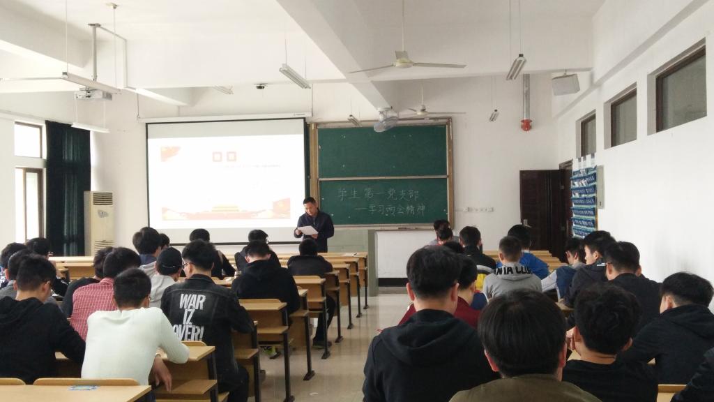 学生第一党支部在机械楼405教室召开党员大会,传达学习贯彻党的十九届二中、三中全会精神,会议由支部书记章军主持。