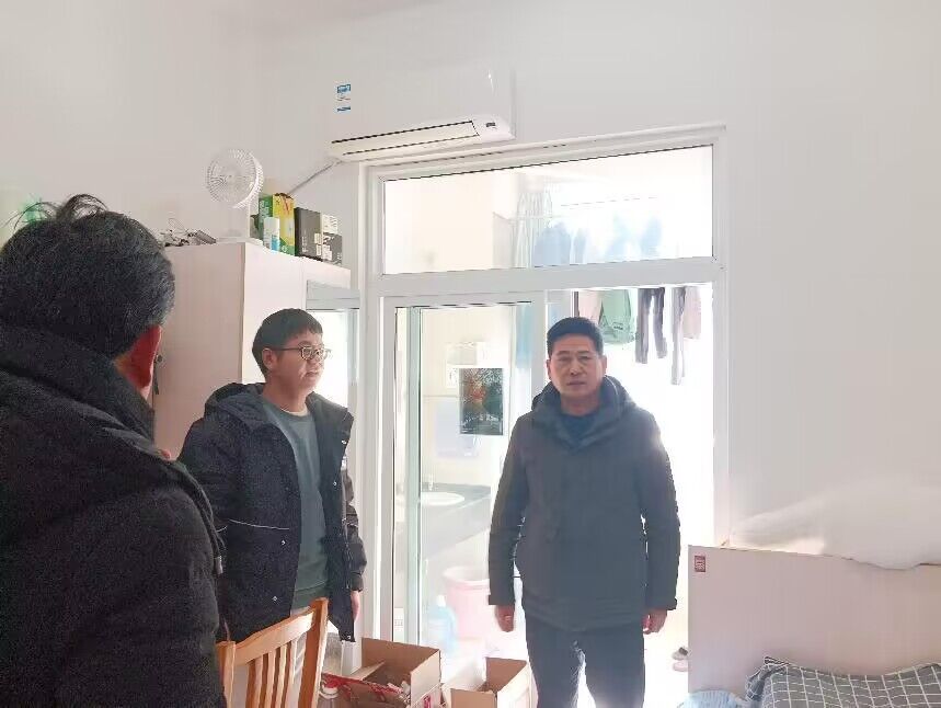 在学生宿舍,学院领导与研究生进行亲切交谈,详细询问他们学习、生活、离校时间、车票购买等情况,叮嘱大家注意人身、财产安全和回家途中交通安全。