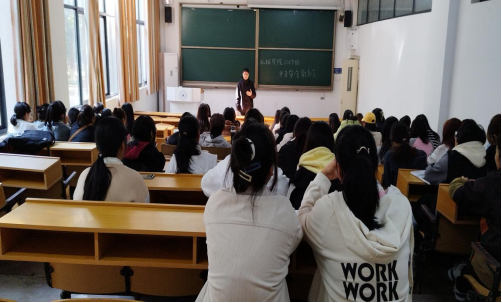 在教一107召开2023级女生安全教育会,学院2023级全体女生参加会议。