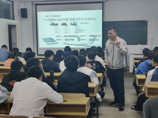 4月26日,机械学院于佳山校区教一302召开了学院2020级“文明健康 绿色环保” 爱国卫生月专项活动总结分析会,会议由2020级辅导员汪辉主持,2020级各班生活委员及寝室长参加了此次会议。