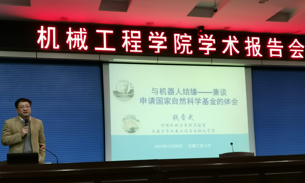1220日,上海大学钱晋武教授来我院为广大师生做了题为《与机器人结缘——兼谈申请国家自然科学基金的体会》的学术报告,报告由刘庆运主持。