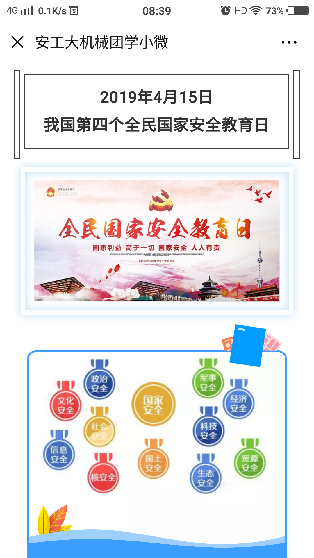 为深入学习贯彻习近平新时代中国特色社会主义思想,坚持总体国家安全观,着力防范化解重大风险,喜迎中华人民共和国成立70周年。4月11日—4月15日期间,机械工程学院开展了国家安全教育日系列活动。