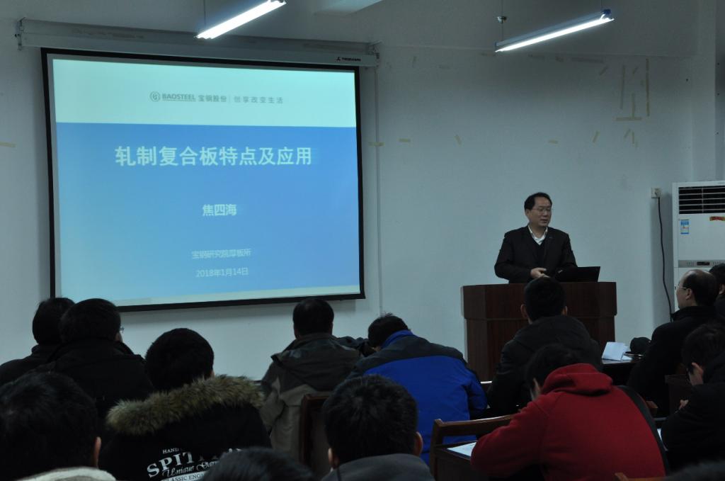 会上,焦四海博士介绍了复合板轧制技术的新发展,以及在冶金、建筑、装备制造等行业的应用。焦博士用详实的数据和大量的案例阐述了轧制复合板对相关行业的促进,报告引起了热烈的反响。在交流环节,焦博士与机械学院师生进行了广泛而深入的讨论,从学术研究、产学研合作等角度探讨了轧制复合钢板带来的新机遇。
