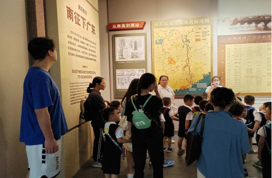 图为和小朋友们一起了解南昌起义结束后起义军前进路线。