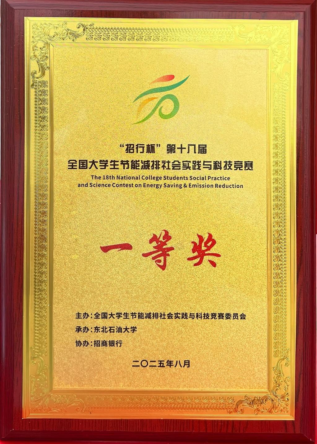 获第十八届全国大学生节能减排社会实践与科技竞赛中一等奖
