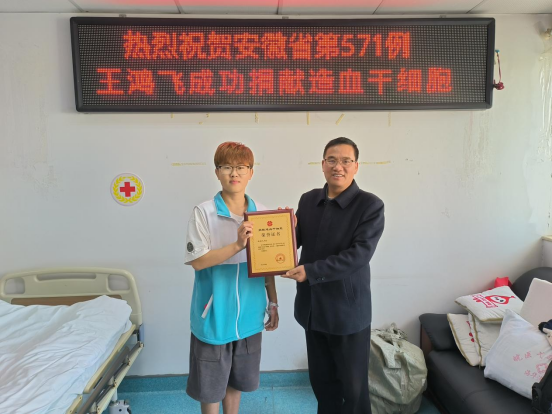第3位捐献造血干细胞的在校大学生、中华骨髓库安徽省第571例、也是马鞍山市最年轻的捐献者,他的造血干细胞将为一名重症患者带去生的希望,赵龙为其颁发了《捐献造血干细胞》荣誉证书。(撰稿:费白露 审核:濮莹萍 周环 陈庆林)