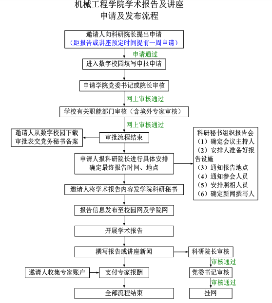 为促进学院的学术交流,扩大与国内外学者的联系,拓宽师生的学科视野,欢迎广大教师邀请与学科方向相关的国内外学者来我院(或线上)开展学术报告及讲座。为规范学术报告及讲座的管理,特制定本流程。经学院研究同意,现予以印发,请遵照执行。
